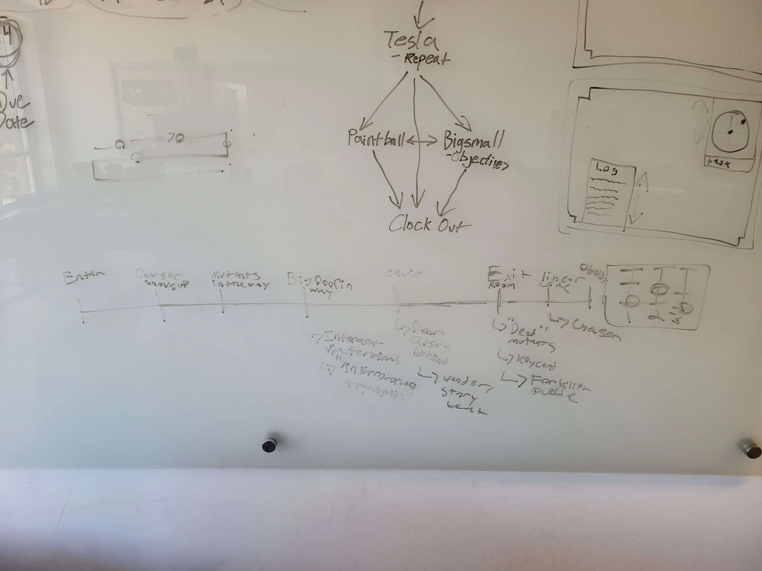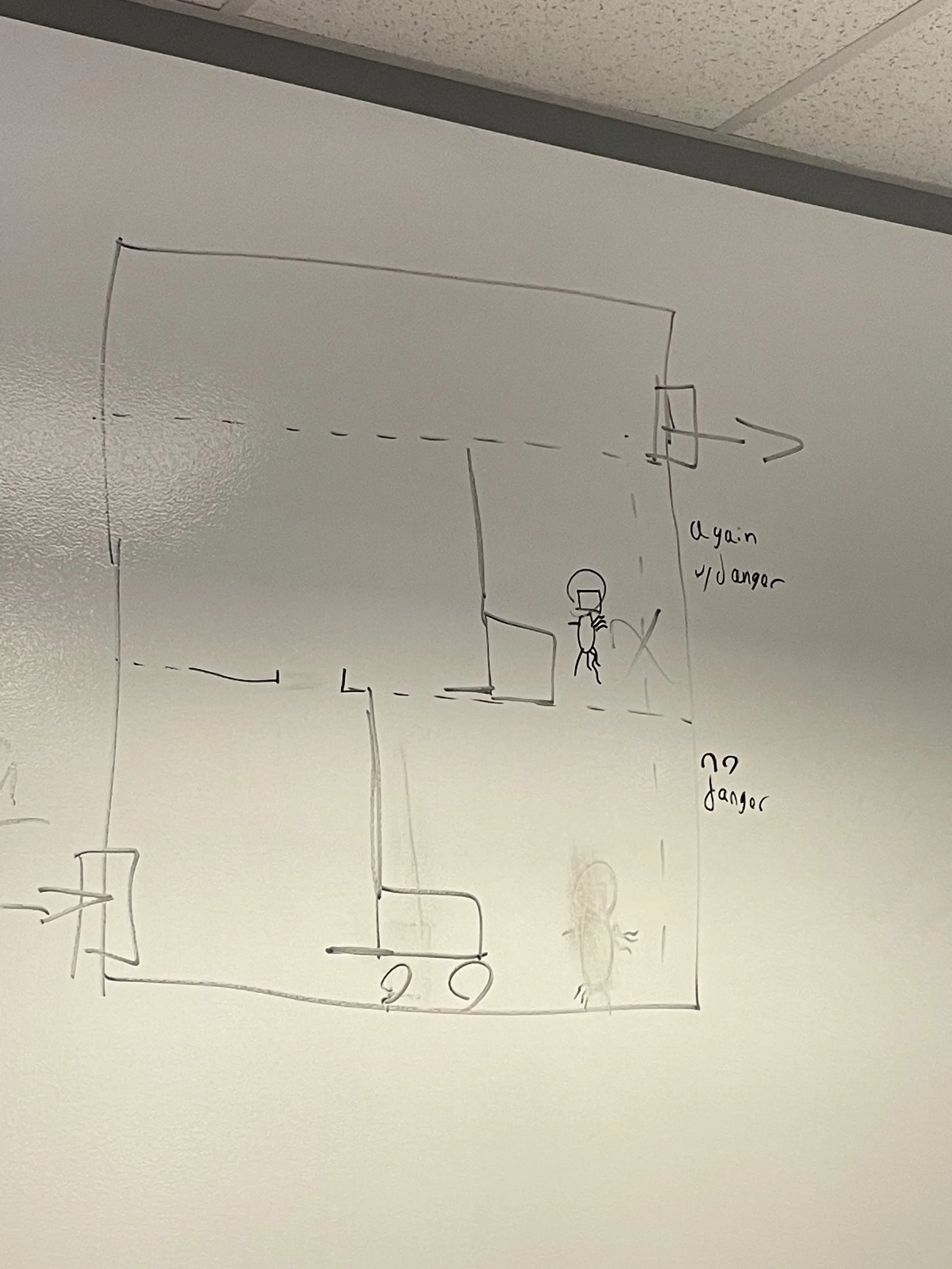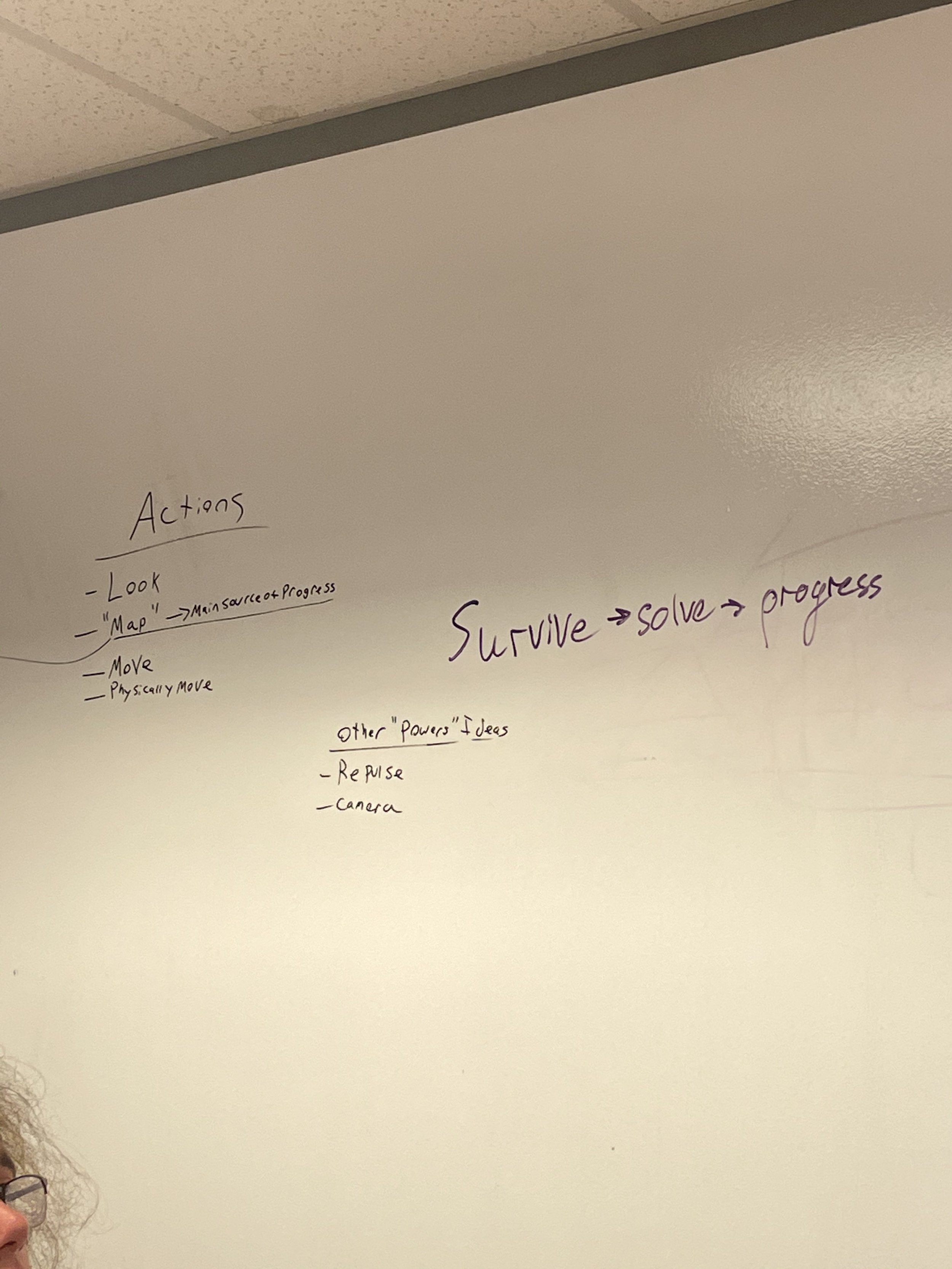 The game mechanics were originally meant to change much more drastically as the player processed. We discussed powerups such as the ability to hack terminals and a repulse shot to push enemies away. Eventually, the only upgrade we kept for the player was the portable terminal access. I implemented a sequence that involved using a charging enemy to break items in a room that would unlock a special tool that let the player always access the overhead maps, rather than forcing them to go to a particular space to use them. I believed strongly in keeping to a few core mechanics and finding unique ways to use them for puzzles and iterating on those abilities rather than adding extra, possibly overwhelming aspects to the game.