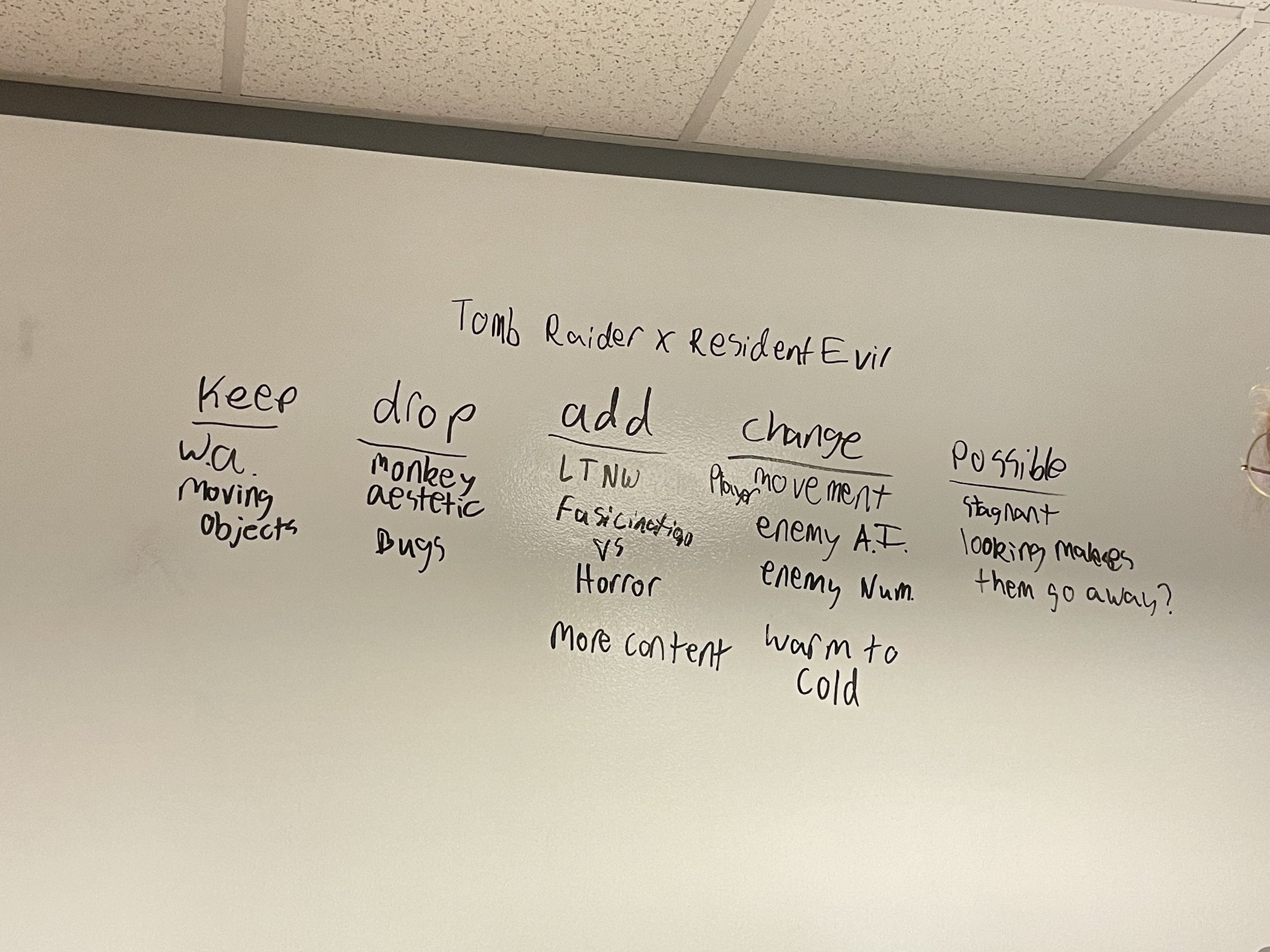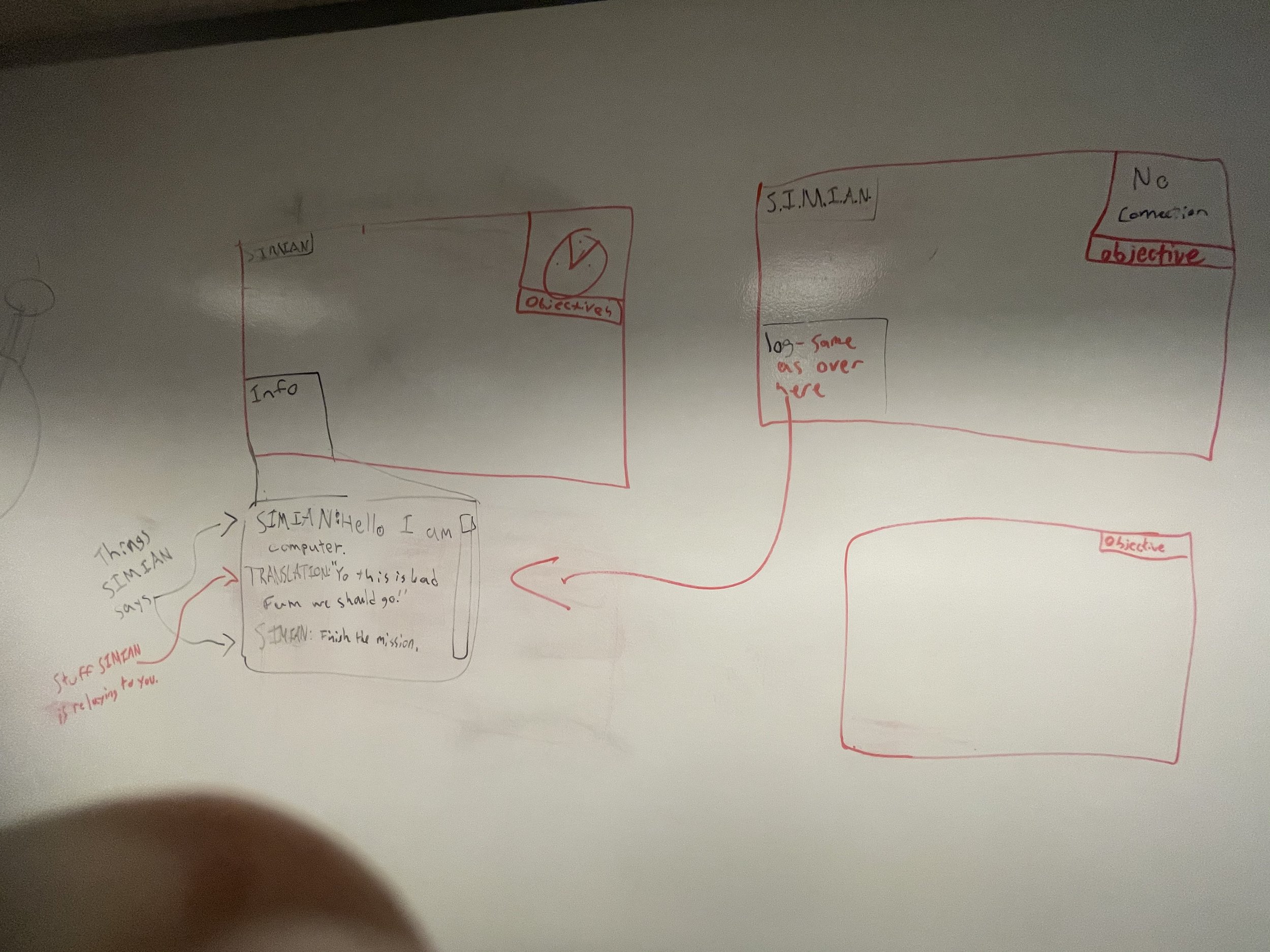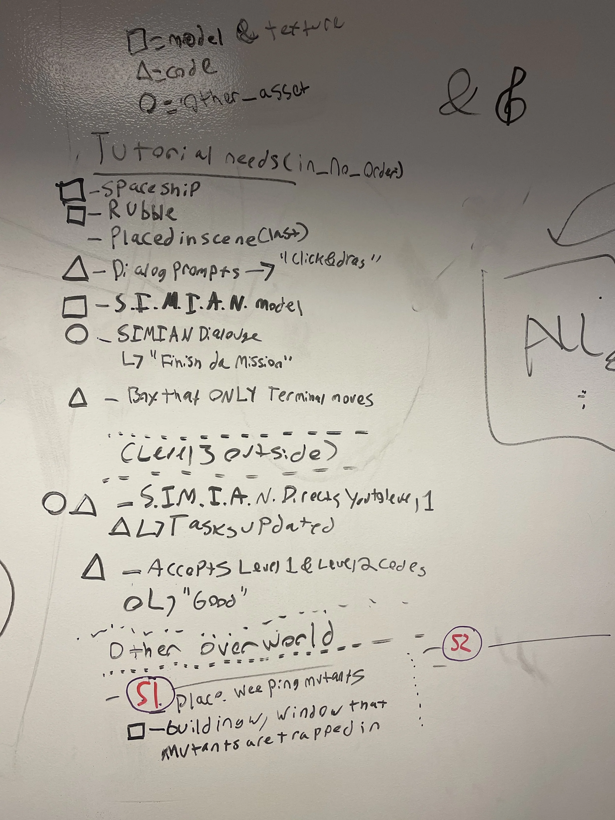 The game mechanics were originally meant to change much more drastically as the player processed. We discussed powerups such as the ability to hack terminals and a repulse shot to push enemies away. Eventually, the only upgrade we kept for the player was the portable terminal access. I implemented a sequence that involved using a charging enemy to break items in a room that would unlock a special tool that let the player always access the overhead maps, rather than forcing them to go to a particular space to use them. I believed strongly in keeping to a few core mechanics and finding unique ways to use them for puzzles and iterating on those abilities rather than adding extra, possibly overwhelming aspects to the game.